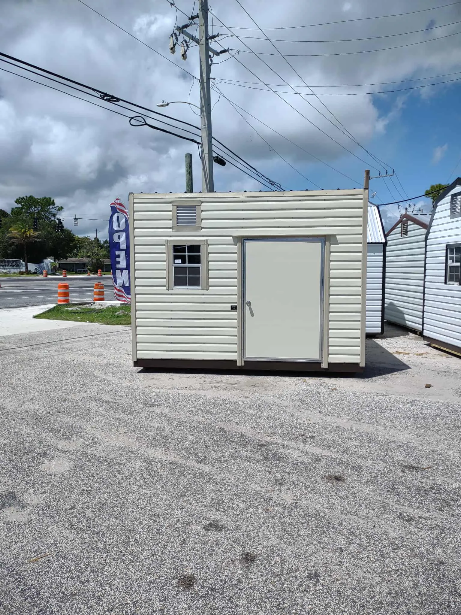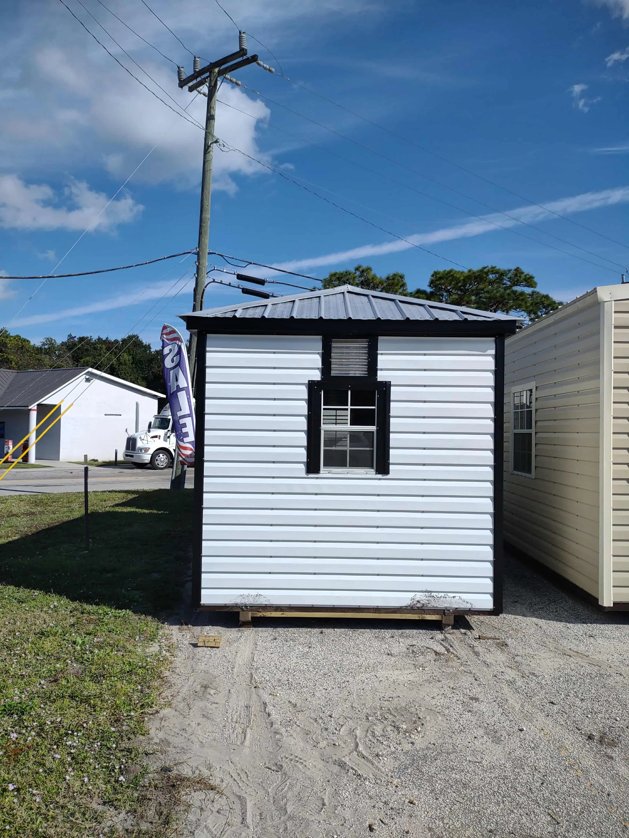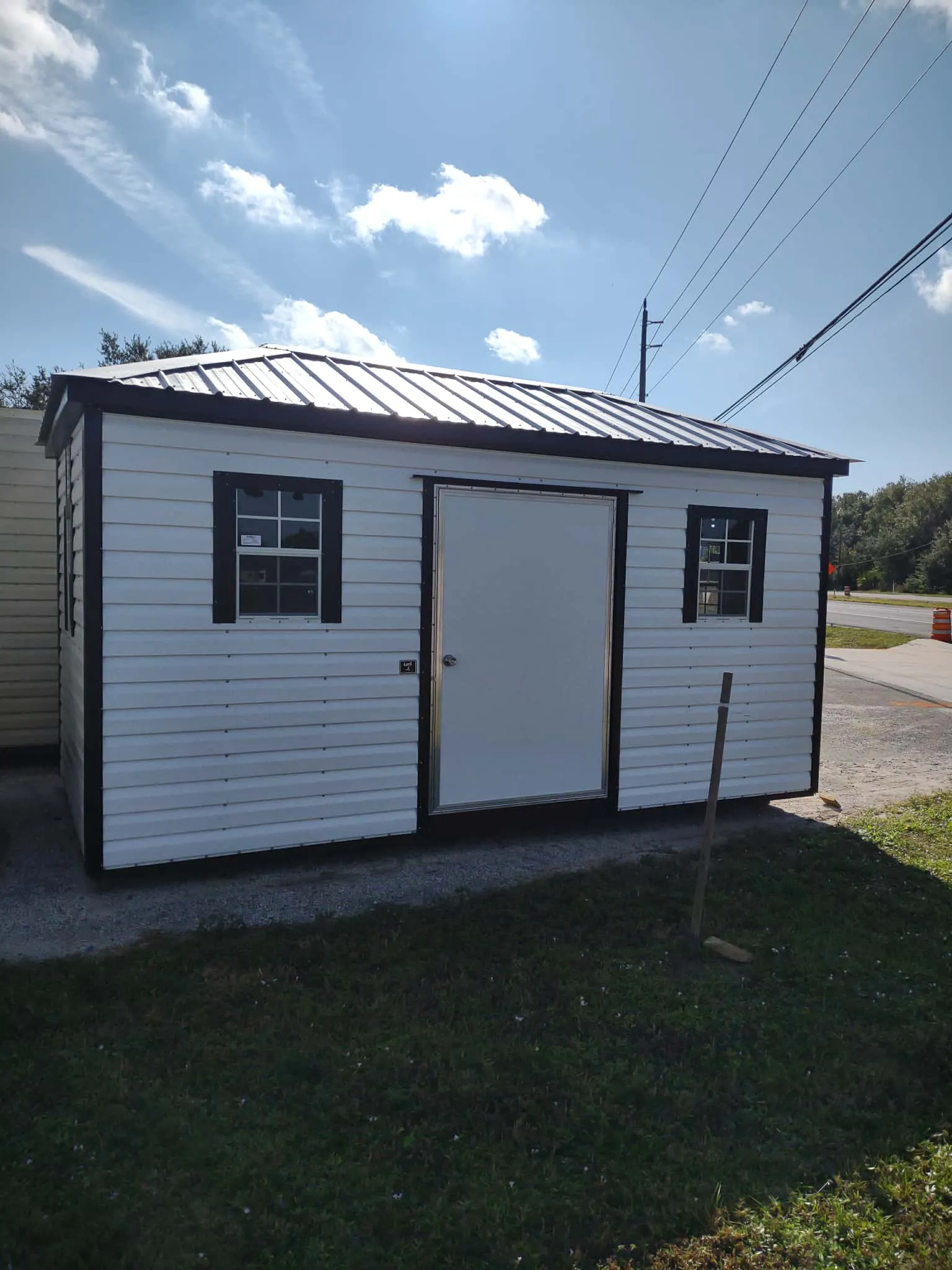 On the lot! New 10 x 16 Lofted barn with White siding, Blue trim and Blue roof. Double doors of 36 x 72. It has 2 windows, 2 vents, 2 lights and 2 outlets.
