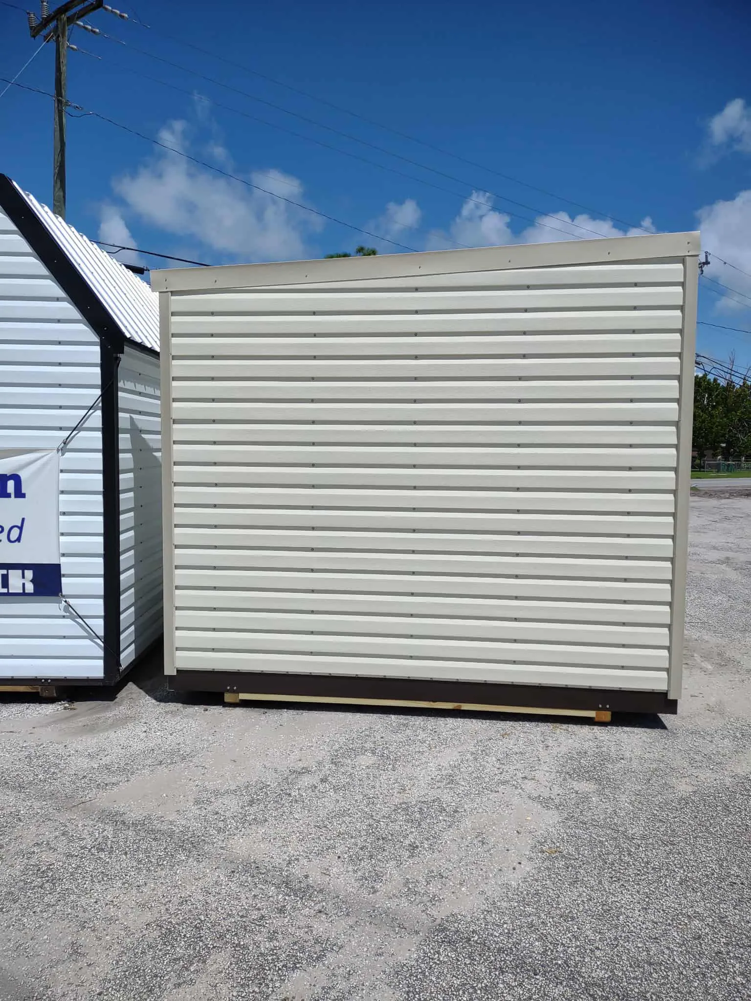 On the lot! New 8 x 10 Lapsider endgable with antique beige siding and brown trim. 46 x 72 door with a 9-lite window, 1 vent, and 1 light/outlet.