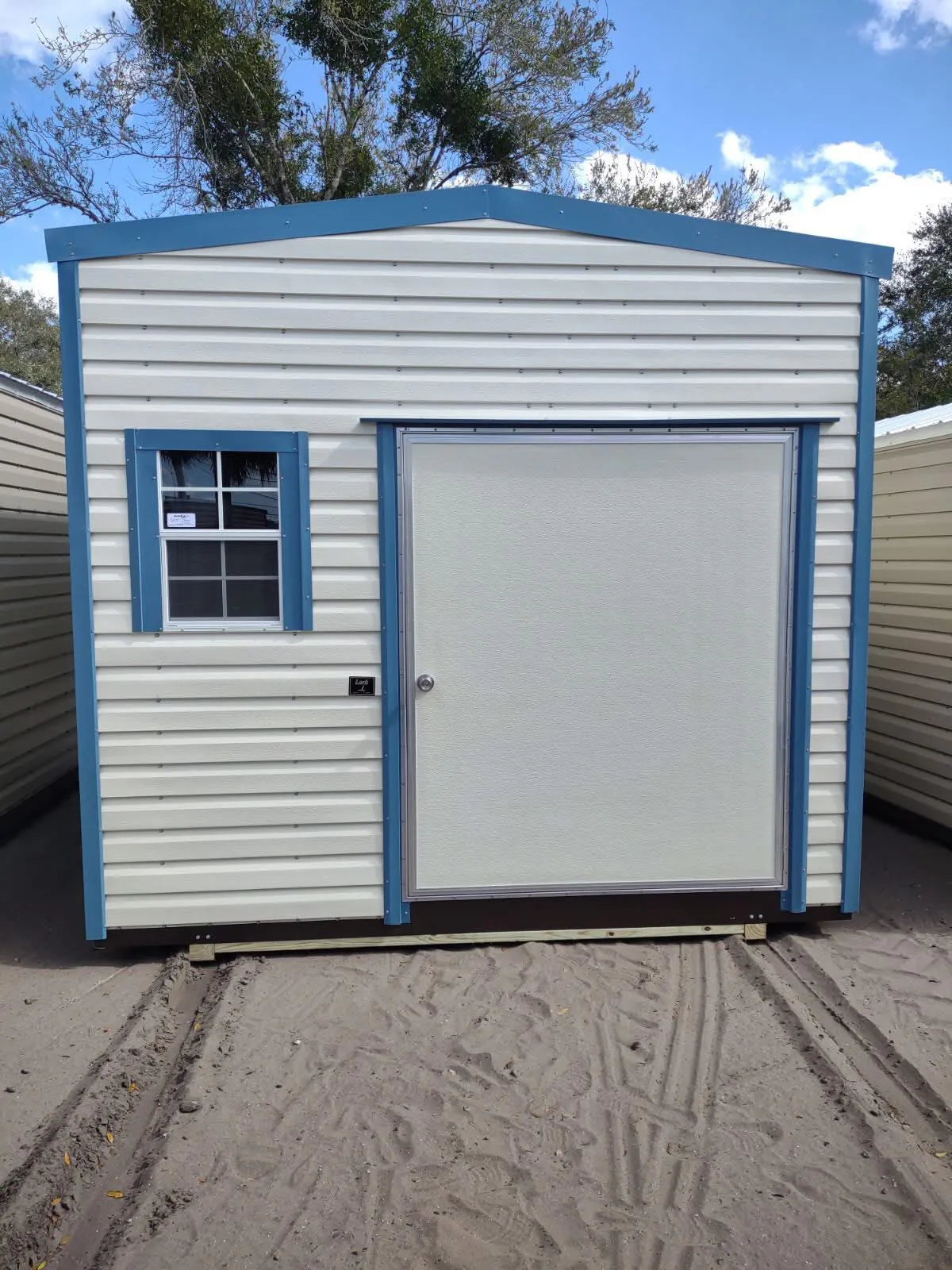 10 x 12 Lapsider Sidegable Dove siding and blue trim. 1 window, 1 vent, 1 light/outlet and a 46 x 72 with a 9 lite window.
