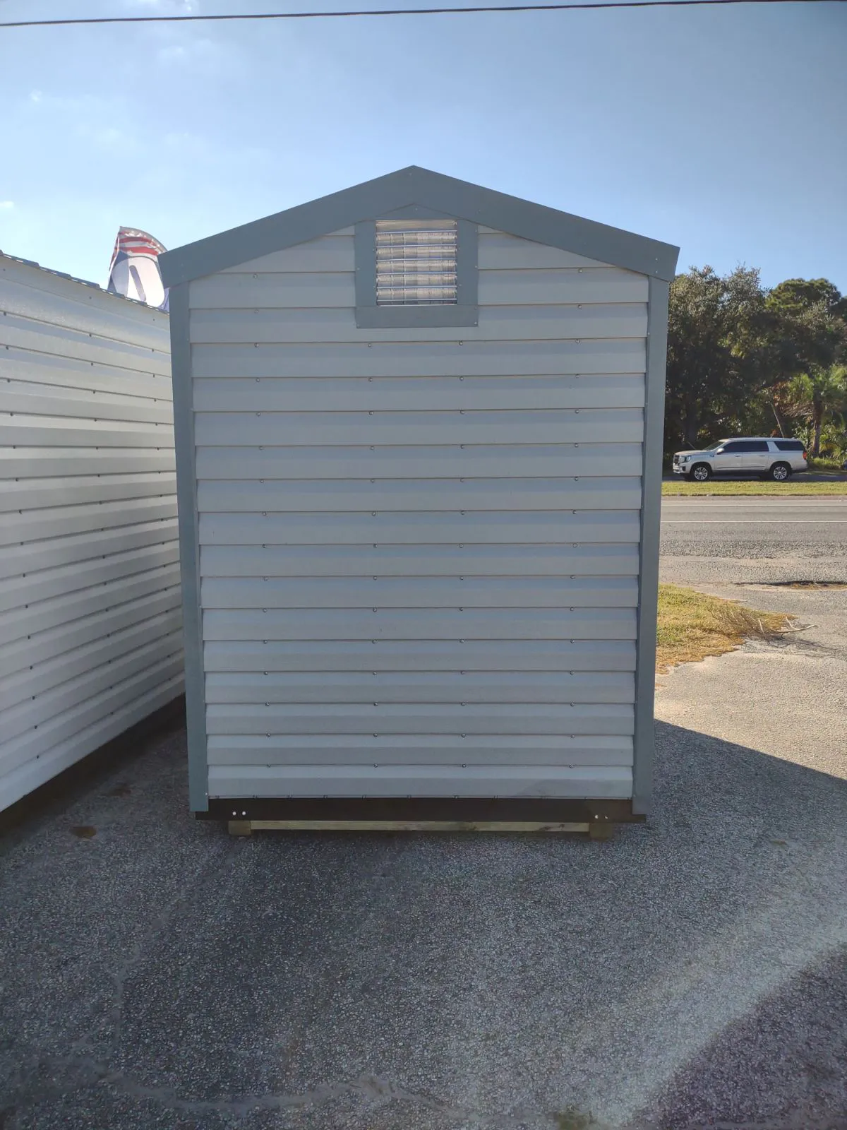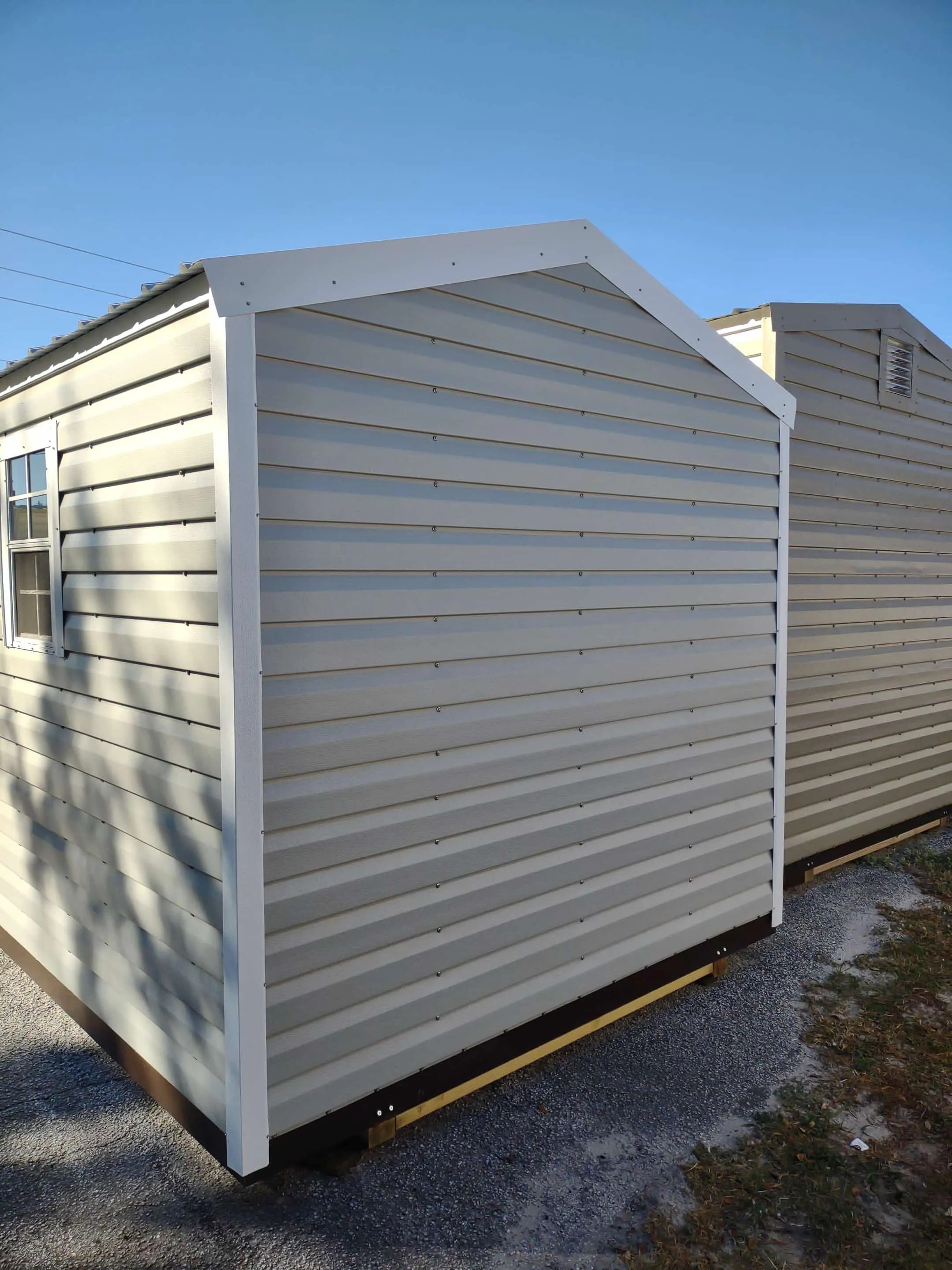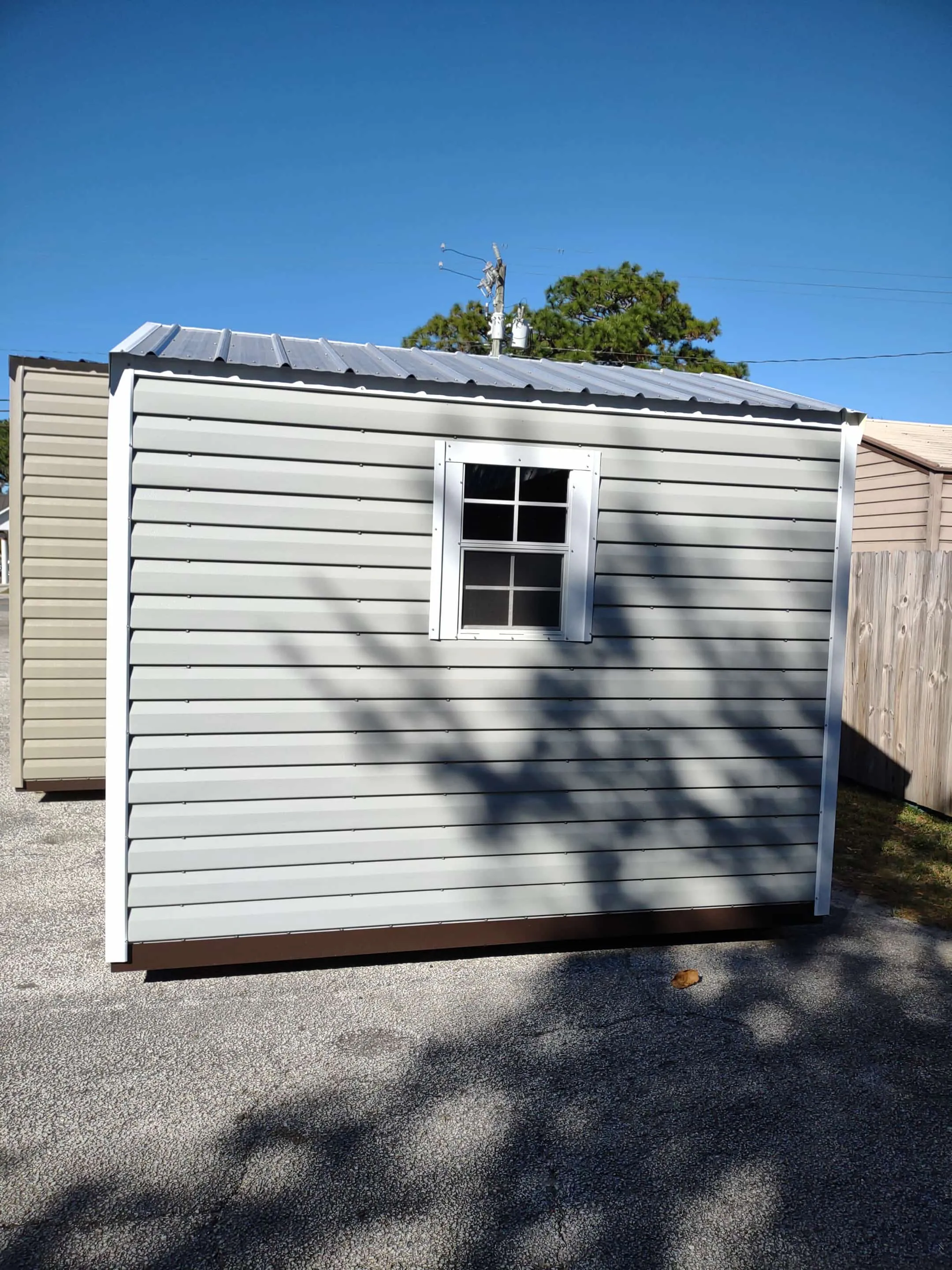 10 x 12 Lapsider Sidegable Dove siding and blue trim. 1 window, 1 vent, 1 light/outlet and a 46 x 72 with a 9 lite window.