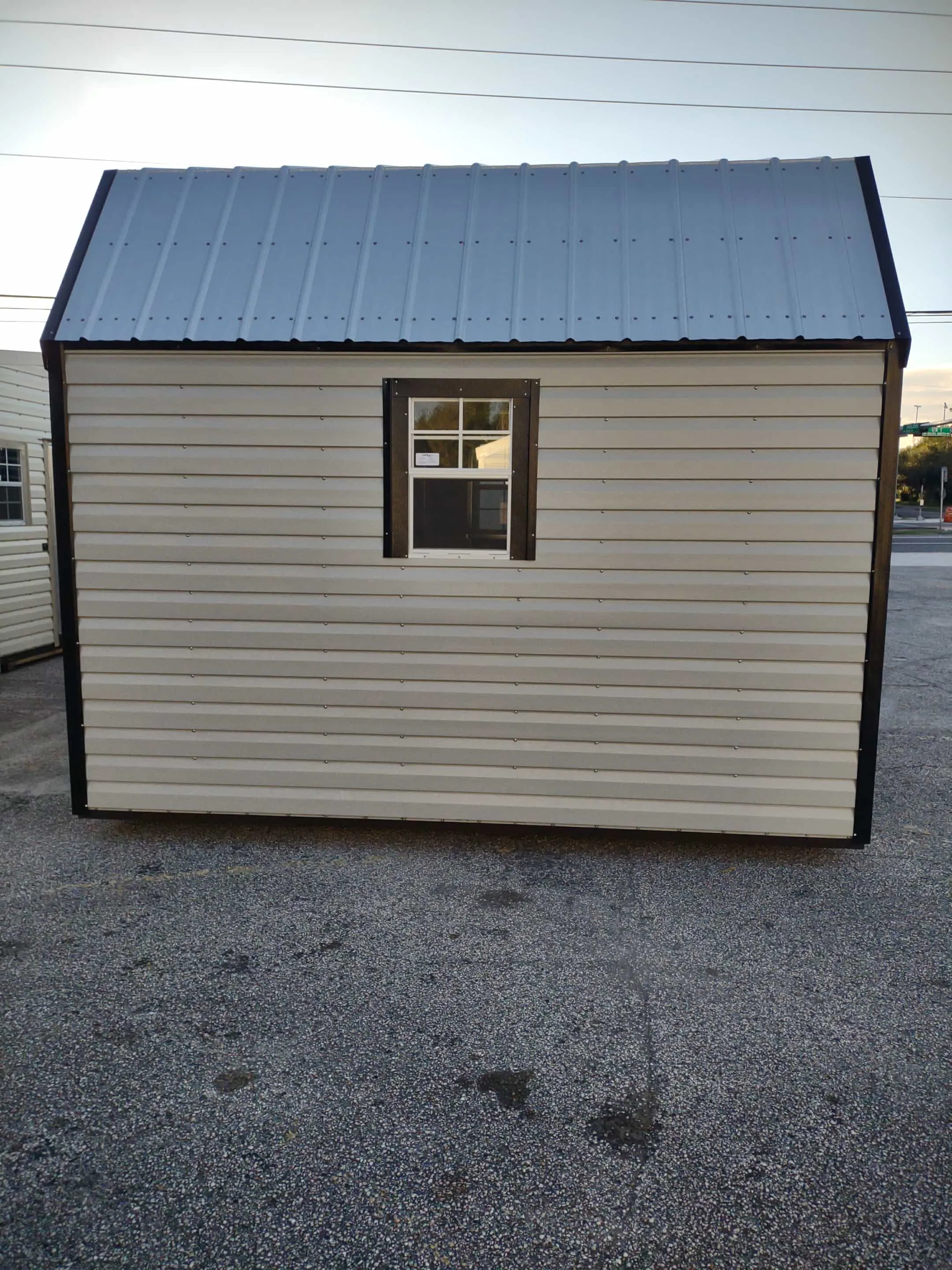 On the lot! This is a new 10 x 12 Lofted barn 4 x 10 front loft. 2 windows, 1 vent, 1 light and 1 outlet. Pewter siding with black trim. Nobody beats our warranty's on a new shed. Free professional delivery & installation!